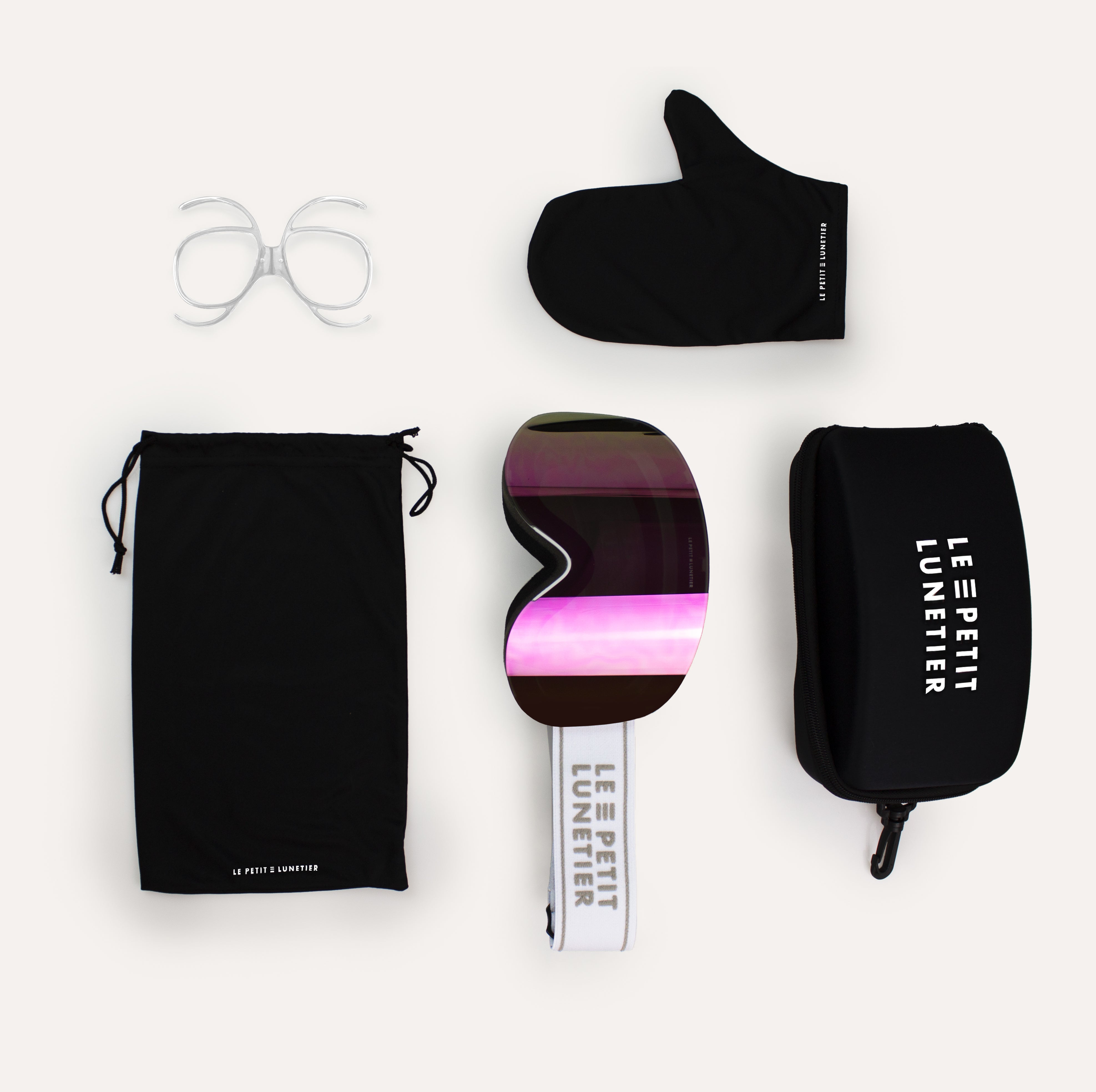 Un étui rigide, une pochette souple et un gant microfibre sont fournis avec chaque masque.